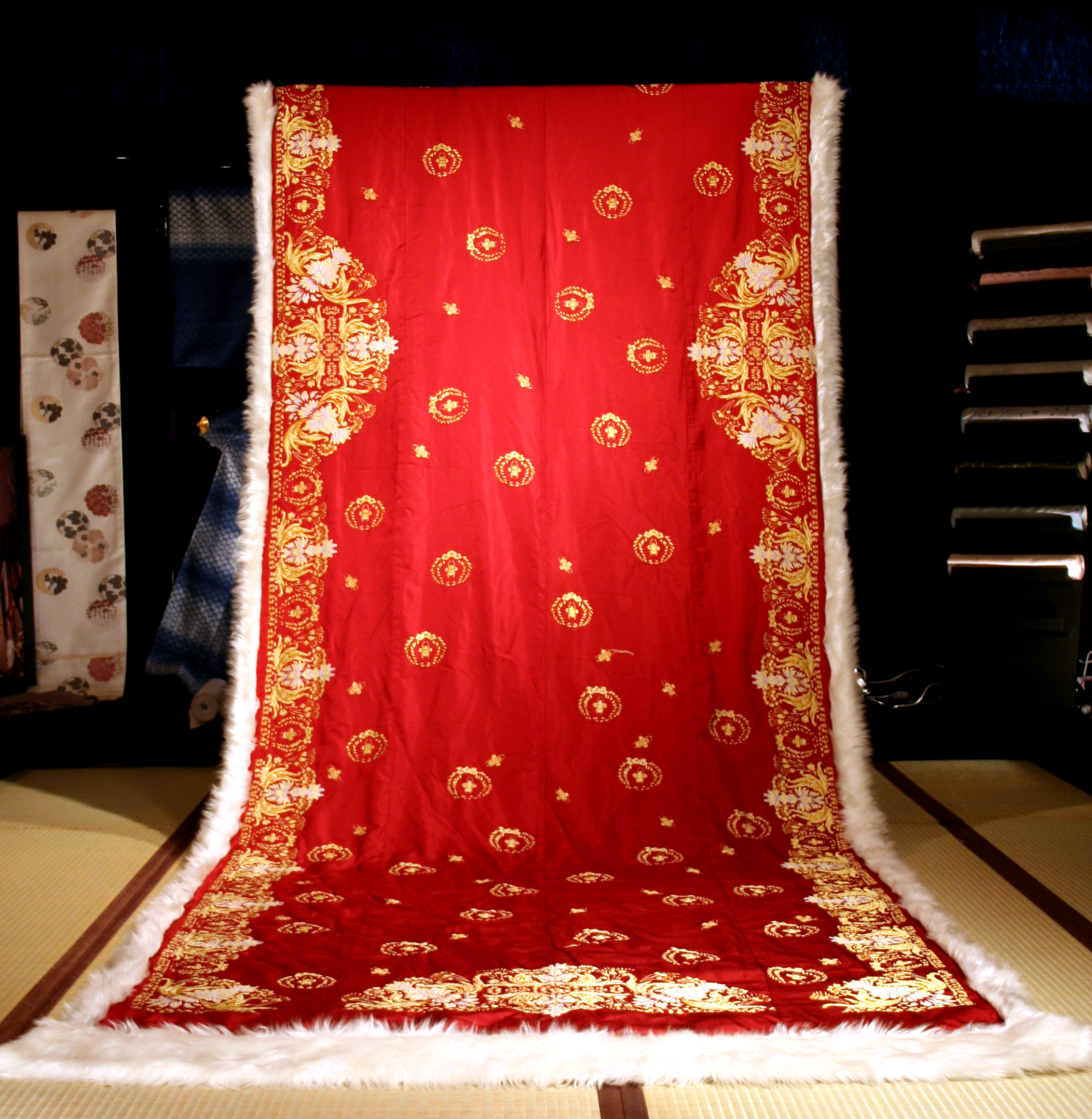 ナポレオンローブとは皇帝ナポレオン一世が1804年パリのノートルダム寺院で行われた戴冠式の際に着用した衣装で、真紅に染められたマントに豪華な装飾が施されたもので、その様子を描いた絵画などに見られる壮大な衣装は、当時のあらゆる服飾技術が結集されて制作されたものであることが伺われます。