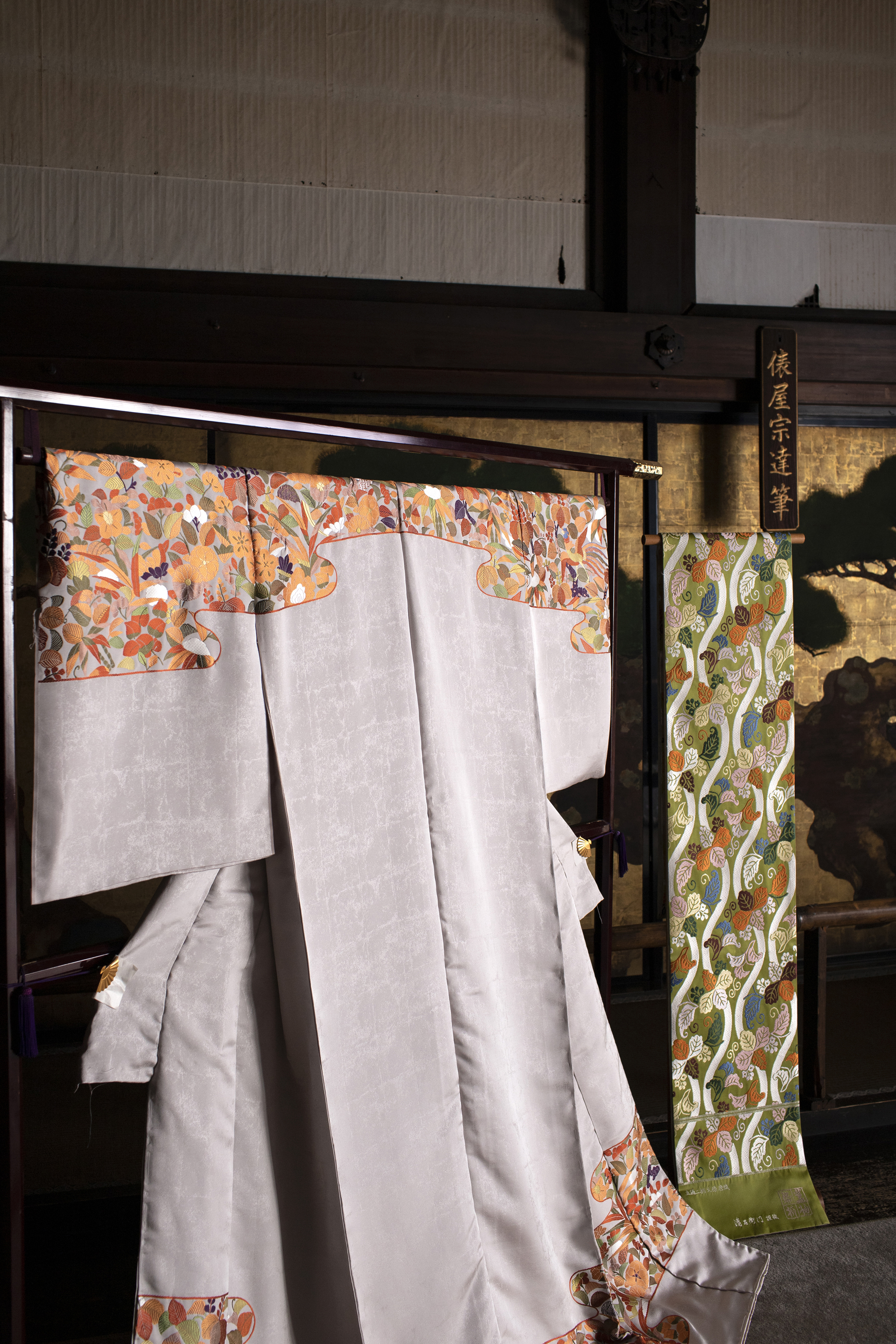 七代清左衛門は唐織の研究制作家であり桃山期の唐織小袖については十分な研究もあるが、平安中期の唐衣装(十二単)の現品は皆無で、源氏物語(第四十九帖 宿木二)の画中、六の君が着装している袿(十二単の表着)を参考として制作しました。